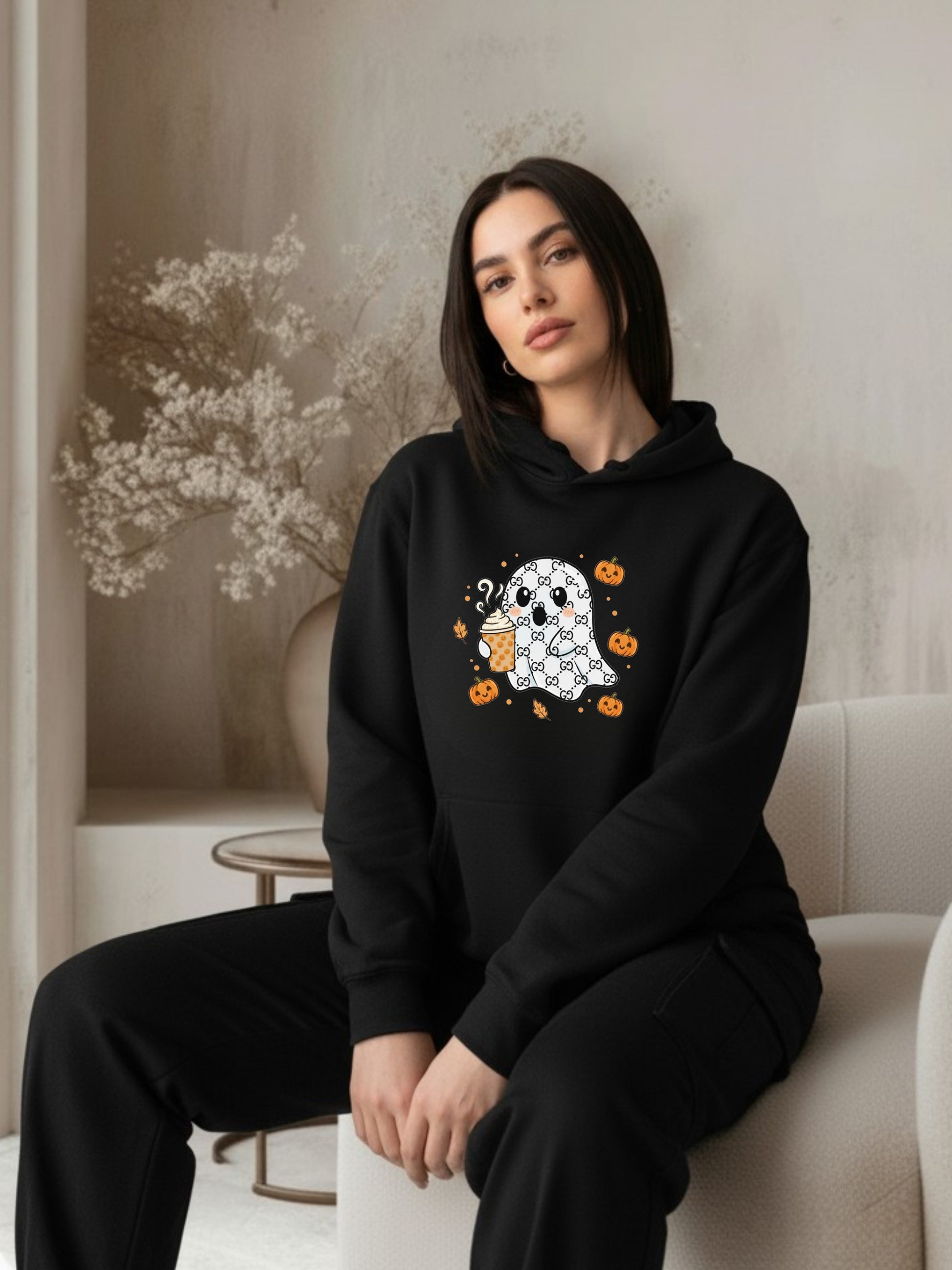 Featuring a bold graphic of a designer-inspired ghost sipping a pumpkin spice latte, surrounded by pumpkins and autumn vibes – this hoodie is the ultimate Halloween essential. Perfect for staying warm, comfy, and fashion-forward while turning heads this season.